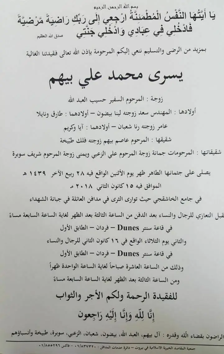 تُقبل التعازي للرجال والنساء في بيروت فردان بقاعة سنتر (Dunes) الطابق الأول، يومي الاثنين (٢٠١٨/٠١/١٥) بعد الدفن من الساعة الثالثة عصرا الى الساعة السابعة مساءً
