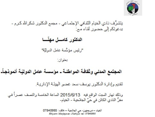 وذلك نهار السبت الواقع فيه 13/6/2015 الساعة الخامسة والنصف عصراً في مقرِّ النادي الكائن في حيّ الجلاحية - الخيام-