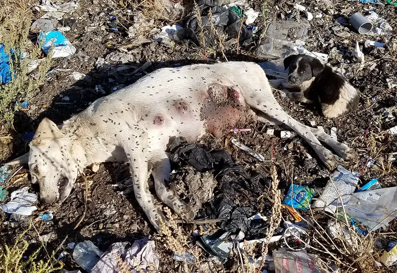 شوهد بعد ظهر اليوم على أحد أطراف بلدة الخيام منظر إنساني مؤلم لكلبة ميتة مرمية على أحد جانبي الطريق، إلى جانبها جروين صغيرين على قيد الحياة، بقيا إلى جانب أمهما.