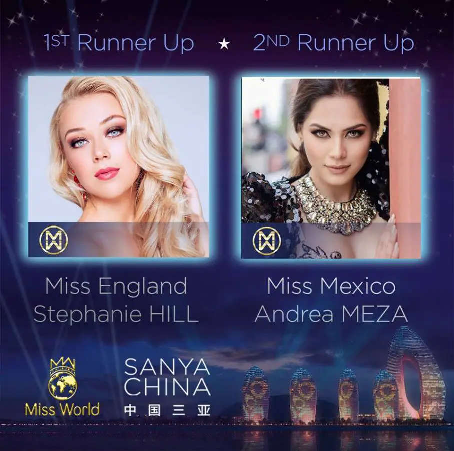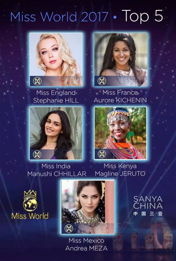 فازت الهندية مانوشي تشيلار بلقب ملكة جمال العالم للعام 2017 التي أقيمت في الصين، فيما احتلت المكسيكية أندريا ميزا المرتبة الثانية والثالثة ذهبت إلى ملكة جمال انكلترا ستيفاني هيل.