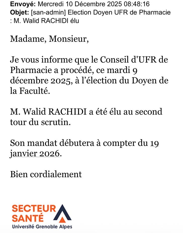 أعلنت اليوم جامعة «غرونوبل آلب» في فرنسا أنّ مجلس وحدة التكوين والبحث في كلية الصيدلة عقد جلسة انتخابية يوم الثلاثاء الواقع فيه 9 كانون الأول 2025، تمّ خلالها انتخاب الدكتور وليد رشيدي عميداً للكلية، وذلك في الجولة الثانية من عملية الاقتراع.