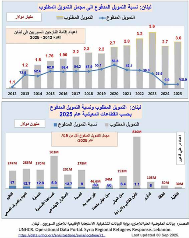 فقد أعلنت المفوضية عام 2025 أن التمويل المحصّل بلغ نحو 265 مليون دولار من أصل التمويل المطلوب، وهو 3 مليارات دولار. أما على مستوى قطاعات الدعم، فقد أوقفت المفوضية الدعم عن العديد من البرامج، وما تقدمه المنظمات الدولية اليوم من دعم مالي هو بمعدل محدود جداً مقارنة مع الدعم السابق، وكذلك بالنسبة إلى الخسائر الضخمة التي يتحمّلها لبنان.