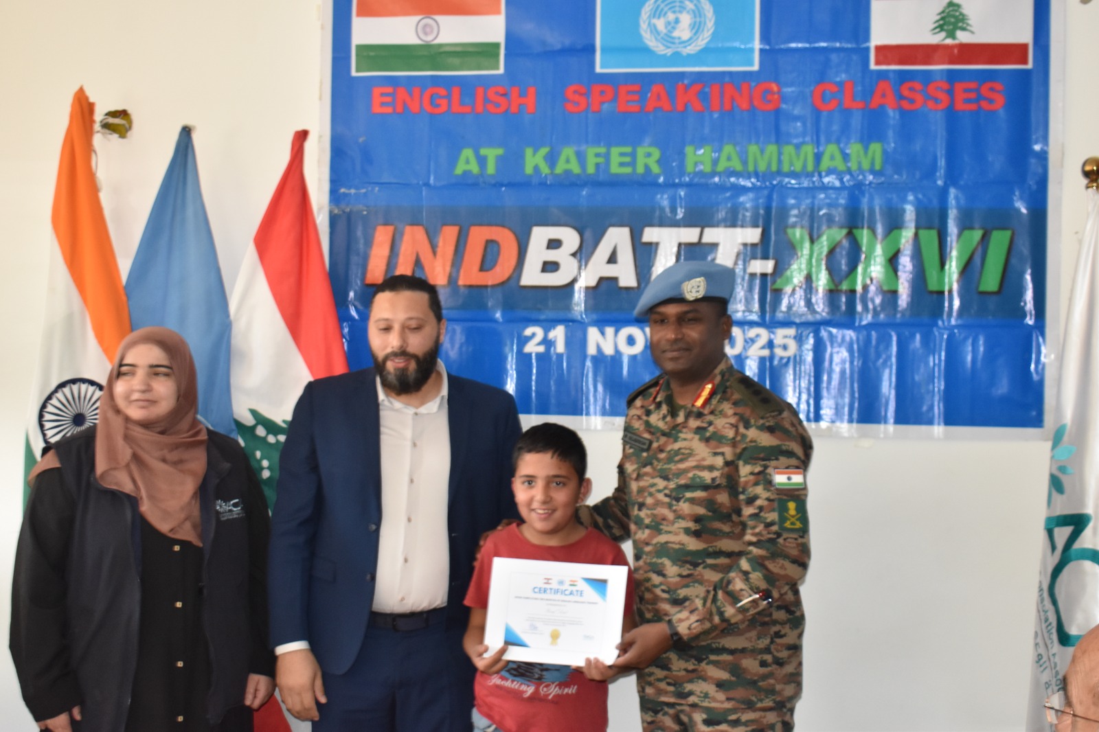 أقامت الكتيبة الهندية اليوم حفل اختتام دورة المحادثة باللغة الإنجليزية التي استمرت لمدة شهرين، في خطوة تُتوّج مبادرة جديدة من مبادراتها المؤثرة في دعم المجتمع المحلي. وكجزء من حفل توزيع الشهادات، جرى تكريم جميع الطلاب الذين شاركوا بجدية وأتمّوا الدورة بنجاح، تقديراً لالتزامهم وتقدّمهم الملحوظ. وقد شارك في هذه الدورة ما مجموعه 40 طالباً وطالبة من قرى كفرشوبا، كفرحمام، والهبّارية.