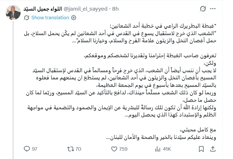 علّق اللواء جميل السيد على عظة البطريرك الماروني الكاردينال بشارة الراعي في أحد الشعانين، والتي شدّد فيها على أنّ “خيارنا السلام”، مستحضراً مشهد دخول السيد المسيح إلى القدس حيث استقبله الشعب بأغصان النخل والزيتون رمزاً للفرح والسلام.