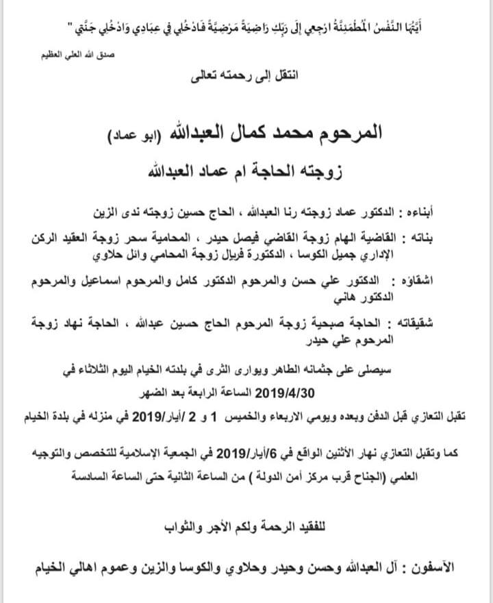 تقبل التعازي يومي الاربعاء والخميس (١ و ٢ أيار ٢٠١٩) بمنزله في الخيام - الحي الغربي محلة الشوار (قرب دارة الوزير)