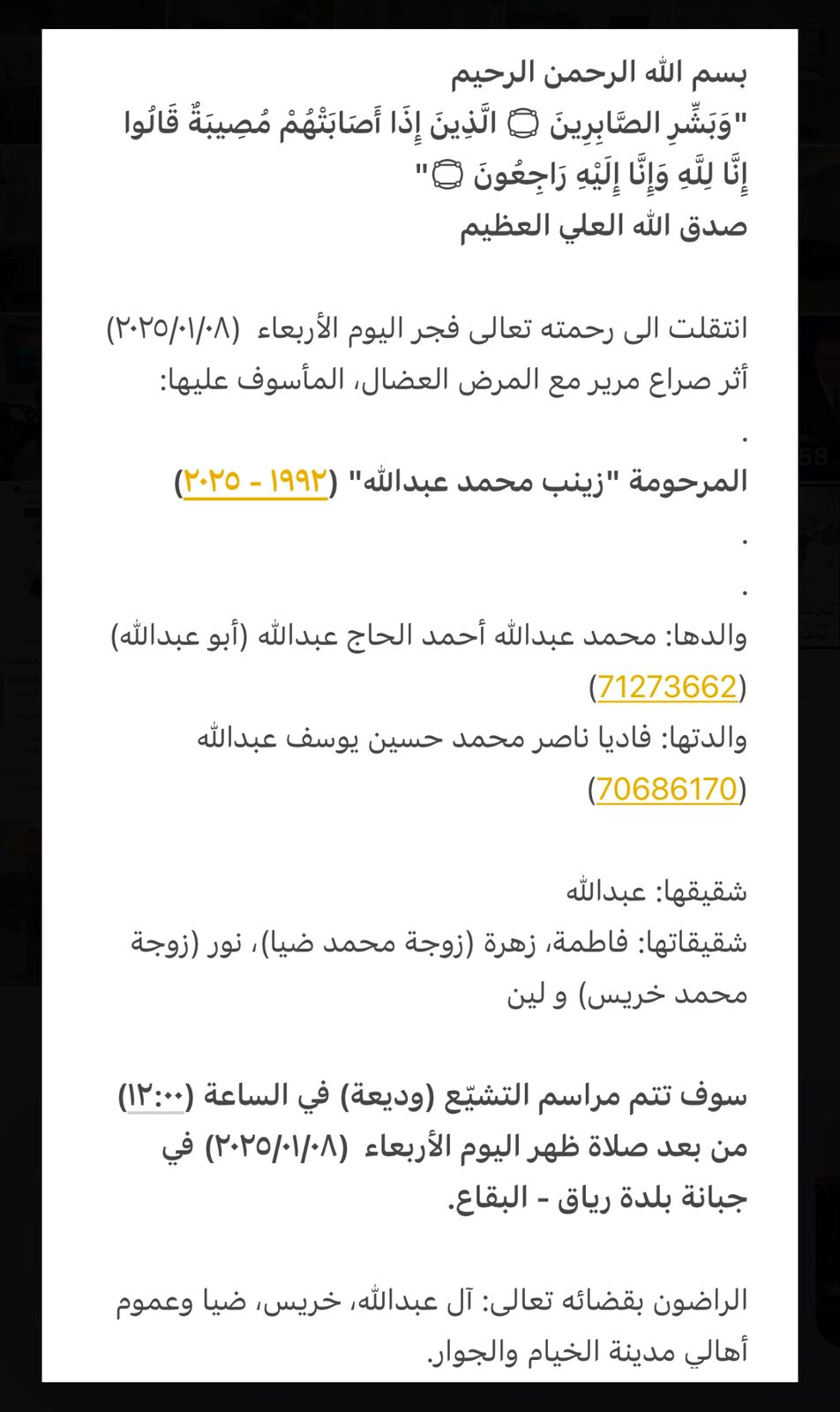 سوف تتم مراسم التشييع (وديعة) عند الساعة ١٢:٠٠ من بعد صلاة ظهر اليوم الأربعاء ٢٠٢٥/٠١/٠٨ في جبانة بلدة رياق - البقاع.