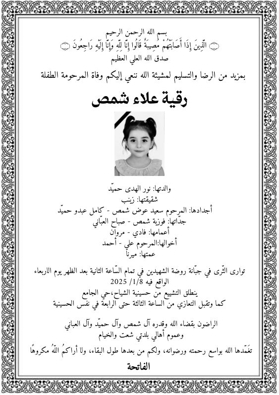 الطفلة المرحومة رقية علاء شمص