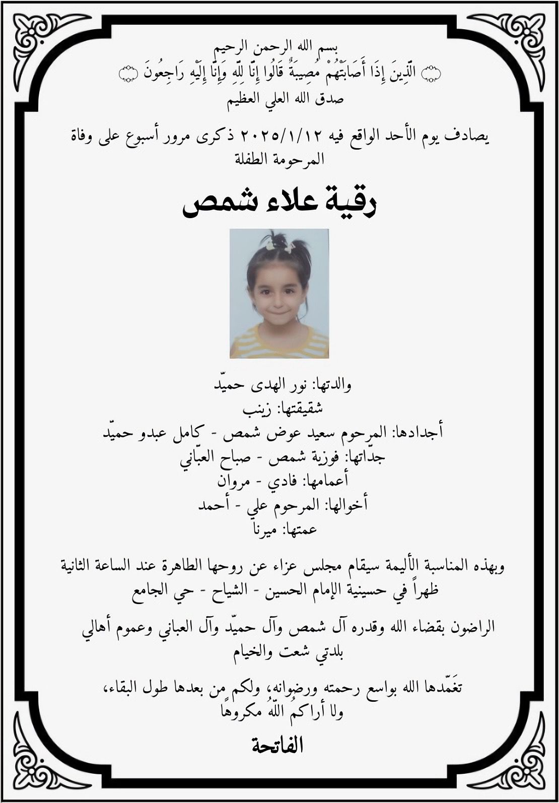 ويصادف يوم الأحد 12_1_2025 مرور أسبوع على وفاتها حيث يقام مجلس عزاء عند الساعة الثانية ظهرًا في حسينية الإمام الحسن - الشياح - حي الجامع