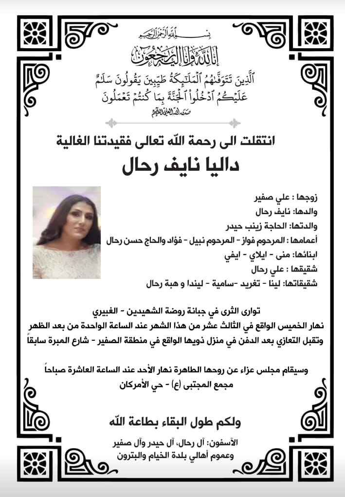تتقبّل أسرة المرحومة التعازي بعد الدفن في منزل ذويها الكائن في محلة الصفير - شارع المبرة سابقاً