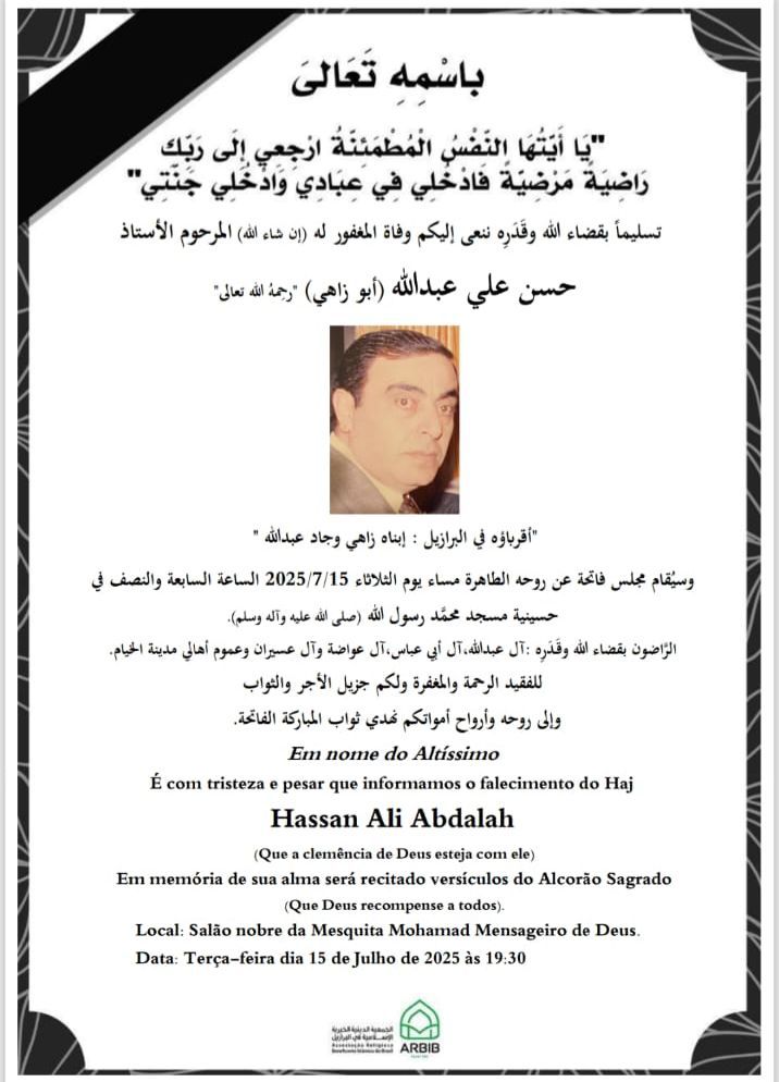 كما، وسيقام مجلس فاتحة عن روحه الطاهرة في الساعة (٧:٠٠) من مساء يوم الثلاثاء القادم (١٥ تموز ٢٠٢٥)، وذلك في حسينية محمد رسول الله (ص) (البرازيل)