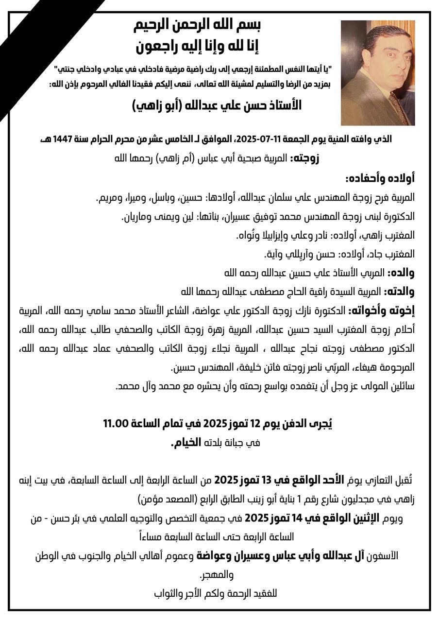 تُقبل واجبات التعازي والمواساة من الساعة (٤:٠٠) عصراً إلى الساعة (٧:٠٠) من مساء يوم الأحد (١٣ تموز ٢٠٢٥) في منزل نجله زاهي (أبو نادر) في الطابق الرابع من بناية (أبو زينب) شارع رقم (١) بلدة مجدليون (صيدا) (المصعد مُؤمّناً)
