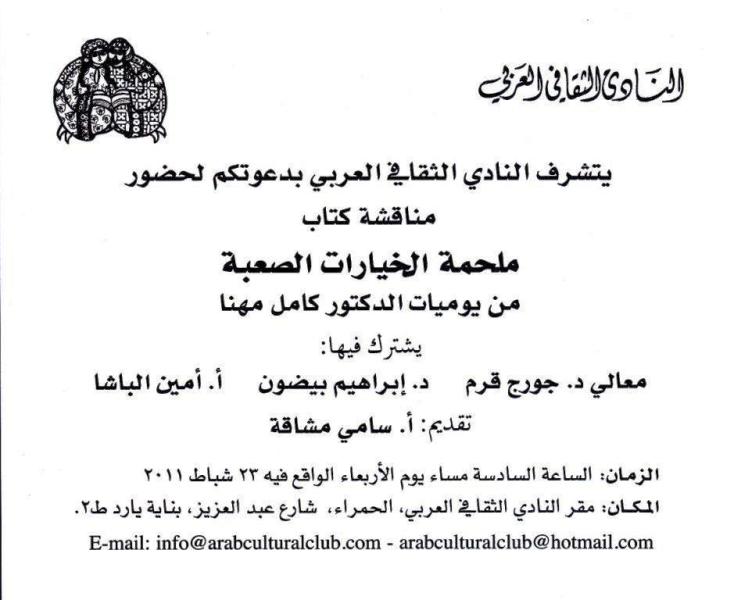 دعا النادي الثقافي العربي لمناقشة كناب ملحمة الخيارات الصعبة من يوميات الدكتور كامل مهنا في مركزه بالحمرا في بيروت.