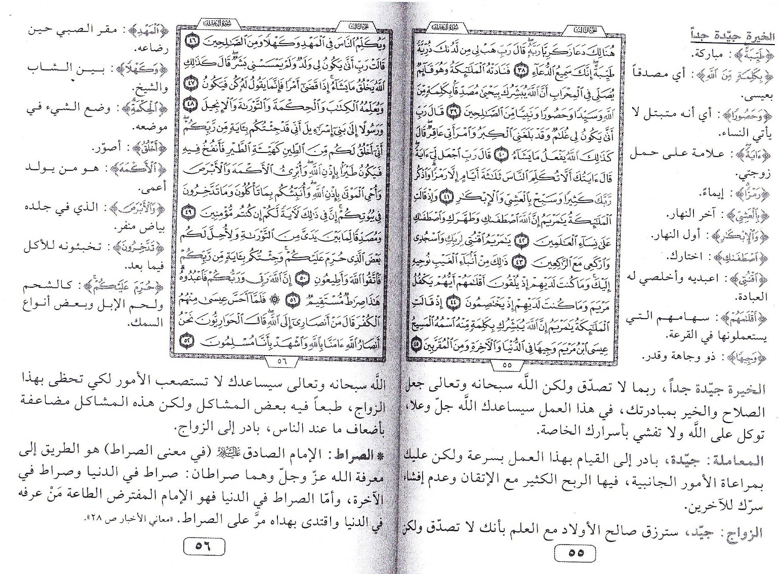ـ مصحف الخيرة ( صفحة 55/66 ) الزواج : سترزق صالح الأولاد مع العلم أنّك لا تُصَدِق, ولكن الله تعالى سيساعدك, لا تستصعب الأمور لكي تحظى بهذا الزواج. المعاملة : جيدة بادر إلى هذا العمل بسرعة, ولكن عليك بمراعاة الأمور الجانبيّة, فيها الربح الكثير مع الإتقان.