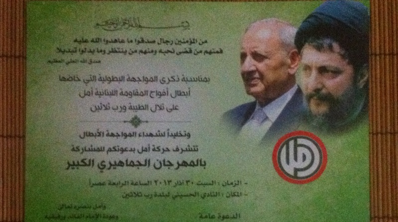 دعت حركة أمل للمشاركة بالمهرجان الجماهيري الكبير الذي تقيمه بمناسبة ذكرى المواجهة البطولية التي خاضها أبطال أفواج المقاومة اللبنانية أمل على تلال الطيبة ورب ثلاثين، في مواجهة جنود العدو الصهيوني، وتخليداً لشهداء المواجهة الأبطال.