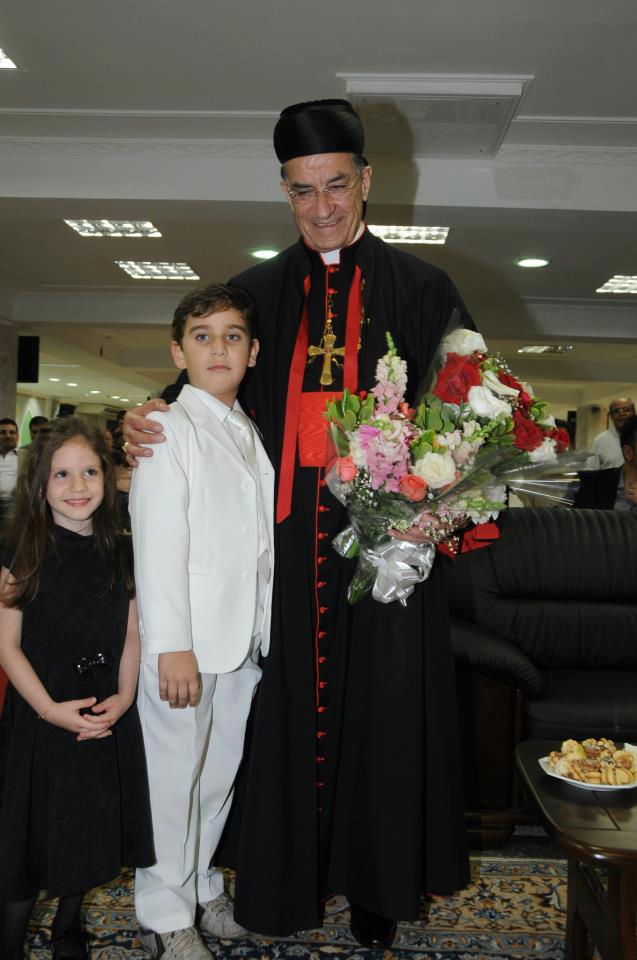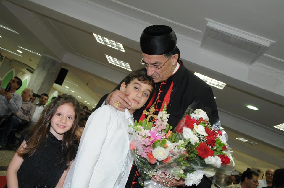 البطريرك الراعي حاملاً باقة الورد التي قدمها له الشاب الصغير طارق خليل عياش من الخيام