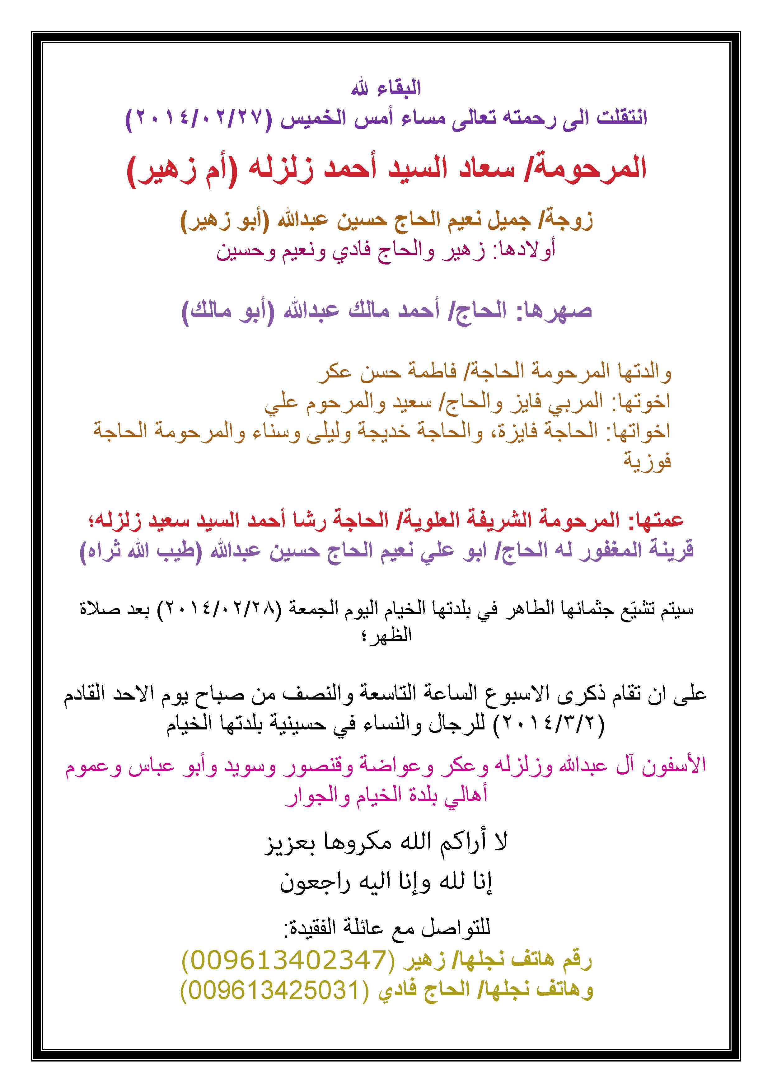 موقع خيام دوت كوم يشارك عائلة الفقيدة الغالية حزنها ويتقدّم إليها بأحرّ التعازي وبالأخص إلى صهرها الصديق الحاج أبو مالك أحمد مالك عبدالله وإلى شقيقها، مربي الأجيال في الخيام، الأستاذ فايز زلزله.
