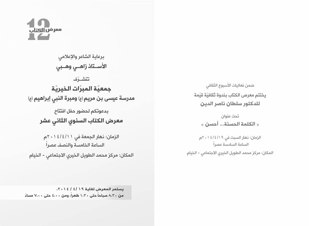 برعاية الشاعر والإعلامي زاهي وهبي، دعت مدرسة عيسى بن مريم(ع) ومبرة النبي إبراهيم(ع) للمشاركة بحفل افتتاح معرض الكتاب السنوي الثاني عشر الخاص بها.