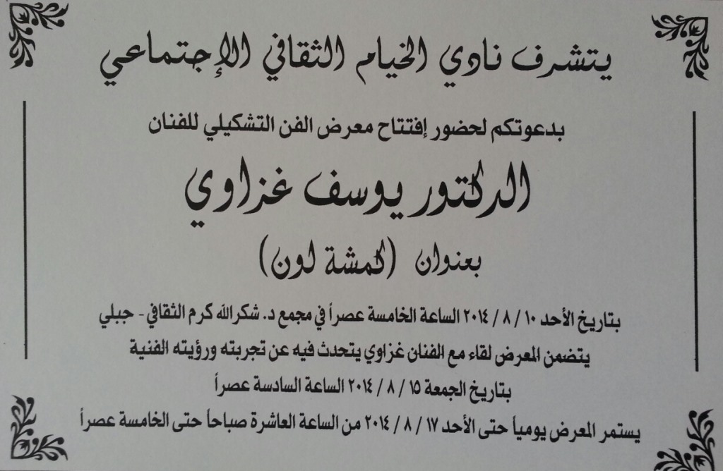 يقيم الفنان الدكتور يوسف غزاوي معرضه التشكيلي في الرسم بعنوان "كمشة لون" في القاعة الكبرى لنادي الخيام الثقافي الإجتماعي بمجمّع د. شكرالله كرم الثقافي - جبلي.