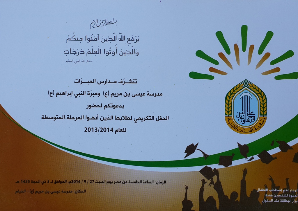 تقيم مدرسة عيسى بن مريم (ع) ومبرّة النبي ابراهيم (ع) حفلاً تكريمياً لطلابها الذين أنهوا المرحلة المتوسطة للعام 2013/2014
