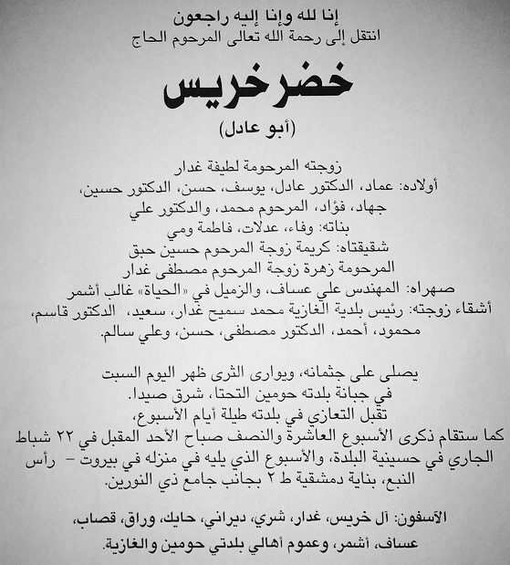 ادارة موقع خيام دوت كوم تتقدّم بأحر التعازي من آل الفقيد ووتخص بالذكر الأصدقاء صهره الإعلامي غالب أشمر وولداه الدكتور عادل والدكتور حسين وعموم آل خريس في الخيام الذين تربطهم بالفقيد صلة قرابة.