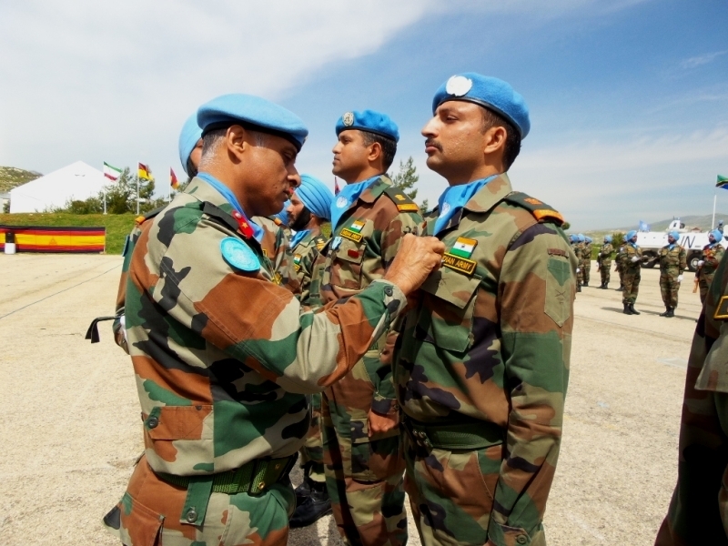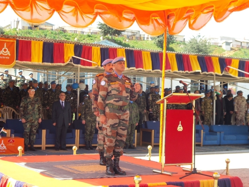 بعد أن استعرض الجنرال كومار الفرق المشاركة من على متن سيارة مكشوفة رافقه فيها الكولونيل داهيا، قلدّ كومار، والسفيرة نيار، ضباط وجنود الكتيبة، "ميدالية الأمم المتحدة لخدمة السلام ".