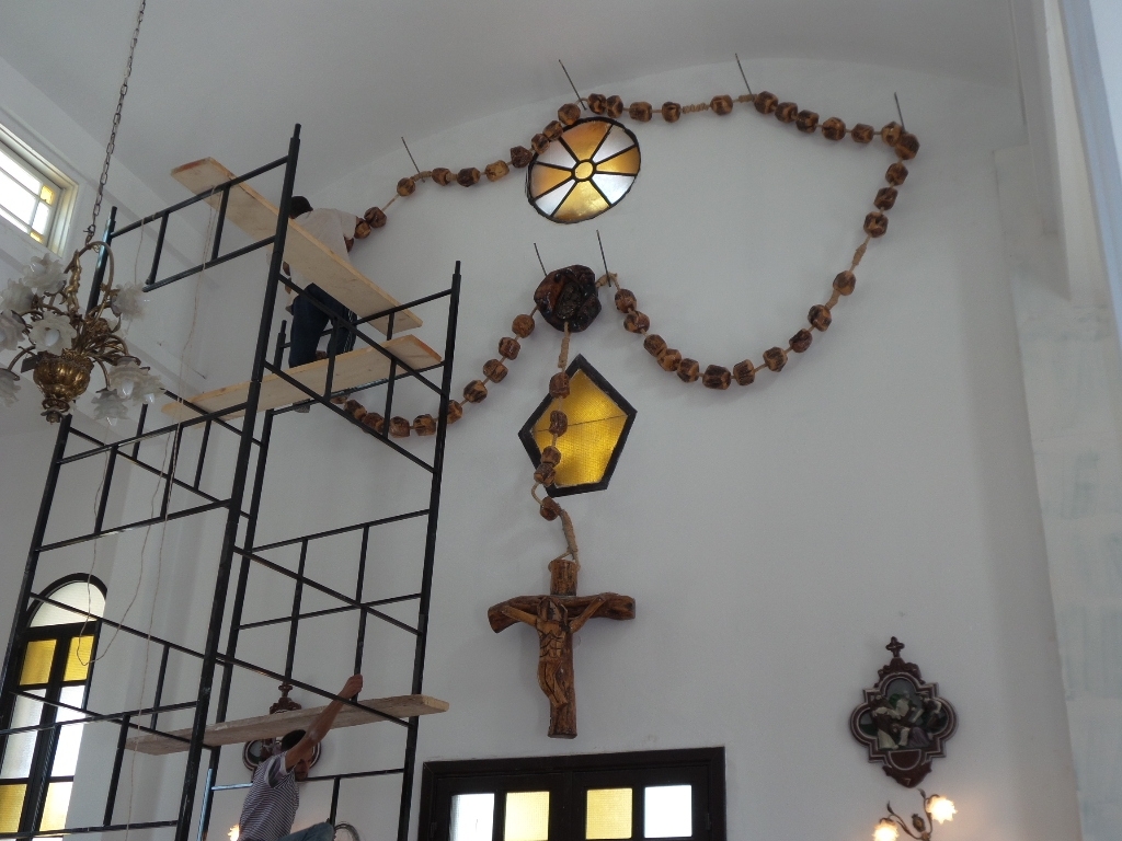 ويتابع نقولا، بدأ بالعمل في محترفه، مستخدما آلات بدائية للنجارة، من منشار للحطب وأزاميل وغيرها، حيث حوّل قطعة من الجذع الى صليب وايقونة العذراء ، ثم بدا بتدوير قطع من الخشب متساوية لتصبح على شكل كرة و بيوت للمسبحة المؤلفة من 59 حبة وتزن كل واحدة منها 3 كلغ، والصليب يزن حوالى 70 كلغ ، ووصلهم بحبل مصنوع من الالياف بطول 25 مترا ( 19 ملم)، مشيرا الى ان صنعها استغرق حوالى الاربعة اشهر الى ان تم جمعها مع بعضها البعض واصبحت جاهزة بحيث وصل وزنها نحو 300 كلغ وطولها 25 مترا .