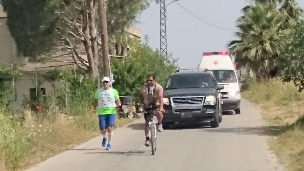 العداء علي وهبه، في ساحة القديس جرجس في بلدة القليعة، يتابع حملة التبرّع بالدم لبنوك الدم