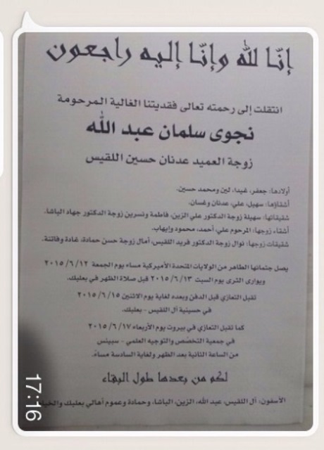 يصل أرض الوطن الجثمان الطاهر للفقيدة المأسوف عليها السيدة نجوى سلمان محمد سلمان عبدالله (زوجة العميد عدنان حسين اللقيس) مساء يوم الجمعة 12 حزيران 2015 من الولايات المتحدة الأمريكية.