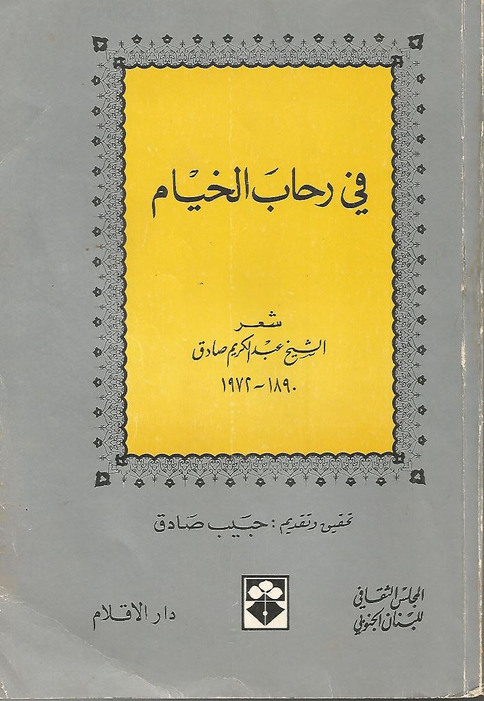 في رحاب الخيام.. كتاب قيّم وجدته بين كتبي القديمة، يتضمّن قصائد للمرحوم الشيخ عبد الكريم صادق، تتناول موضوعات متعددة، كالشعر العرفاني والمدائح والمراثي والخواطر .
