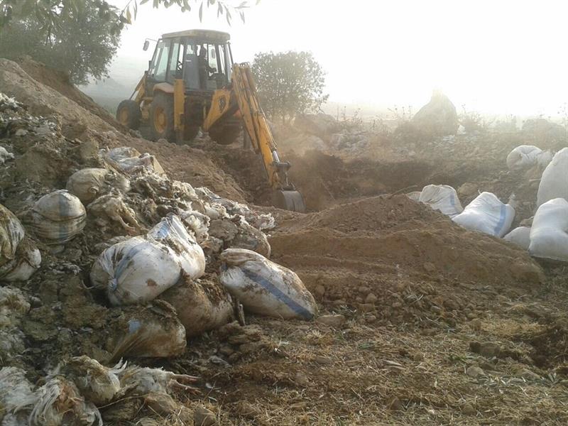 حفارة تعمل على طمر الدجاج النافق في المجيدية - (طارق ابو حمدان)