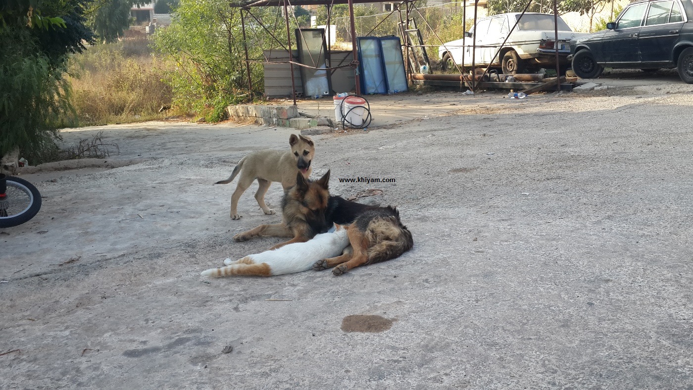 ظاهرة غريبة شاهدتها في أحد شوارع الخيام: كلبة تُرضع قطة في أحد الشوارع القريبة من المدخل الشمالي للبلدة.