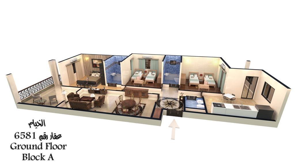 كل طابق في المبنى الكبير يحتوي على شقتين سكنيتين، مساحة كل منهما 170 مترا مربعا تتكون كل منهما من 3 غرف نوم وصالون كبير و3 حمامات (حمام رئيس في غرفة النوم الرئيسية).