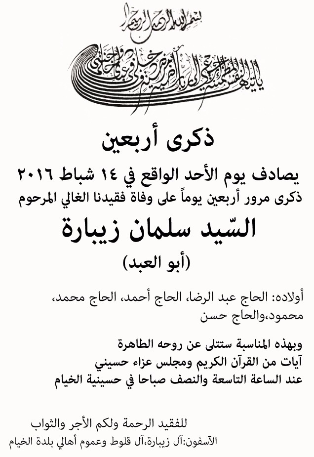 يصادف نهار الأحد الواقع فيه 14 شباط 2016 ذكرى مرور أربعين يوماً على وفاة فقيدنا الغالي الوالد المرحوم