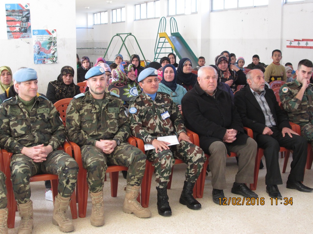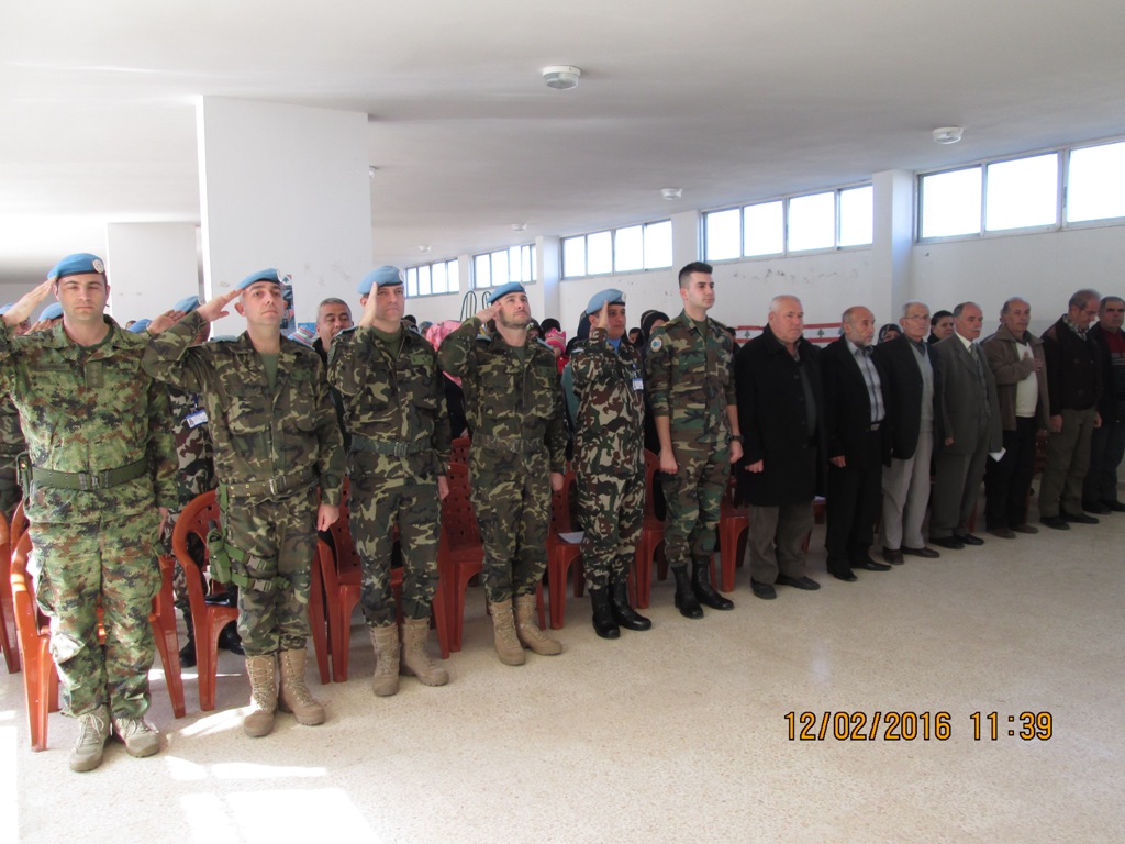 رعى الاحتفال، الذي أقيم في قاعة المدرسة، مسؤول وحدة التعاون المدني – العسكري الميجور الونزو رويث دي اونيا ممثلا قيادة القطاع الشرقي في اليونيفيل، بحضور الوحدة النيبالية المقدم أمريت باهادور بوهورا، بحضور رئيس البلدية شكيب قطيش، مدير المدرسة طلال جواد والهيئة التعليمية والادارية، مضباط اسبان وضباط ارتباط من الجيش اللبناني، رؤساء بلديات ومخاتير وفاعليات والاهالي.