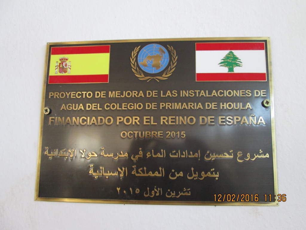 ضمن إطار تنفيذ المهمات الموكولة اليها بموجب قرار مجلس الامن الدولي 1701، وبهدف توطيد أواصر الصداقة والتعاون مع السكان المحليين في منطقة عملها. دشنت الكتيبة الاسبانية العاملة فى قوات "اليونيفيل" المعززة في الجنوب، بالتنسيق مع الكتيبة النيبالية، مشروع تجهيز خزان مياه جديد وفيلتر مياه وموزع كلور لتوفير مياه شرب نظيفة لطلاب مدرسة حولا الرسمية في قضاء مرجعيون وتأهيل مغاسل ومراحيض المدرسة، بتمويل من المملكة الاسبانية، بكلفة قدرها 7000 $ أميركي.