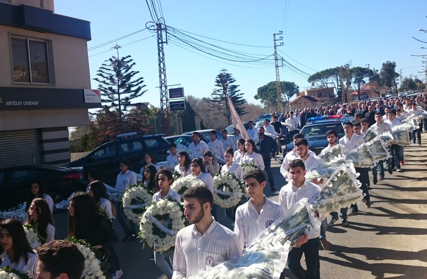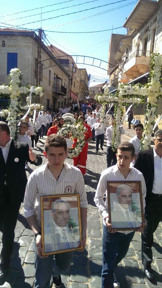 جثمان الفقيد انطلق في موكب سيار من مستشفى مرجعيون الحكومي، مرورا بمدرسة مرجعيون الوطنية(الكلية) التي قضى نصف عمره في في حقل التعليم والادارة وتربية اجيال واجيال من التلامذة منذ أكثر من أربعين سنة، حيث كان في انتطاره امام الكنيسة الانجيلية على بولفار مرجعيون، حشد من المواطنين والفاعليات، وأعدّ لموكبه إستقبالأ حافلاً تقدمه حملة الأكاليل والورود وصوره. ولحظة الوصول، حُمل الجثمان على أكف المشيعين وشاركهم تلامذة وخريجو مدرسة مرجعيون الوطنية، سيراً على الأقدام، مخترقاً الشارع الرئيسي للبلدة، وصولاً الى كنيسة القديس جاورجيوس للروم الارثوذكس في وسط البلدة، حيث سجي النعش في صالون الكنيسة لإلقاء نظرة الوداع.