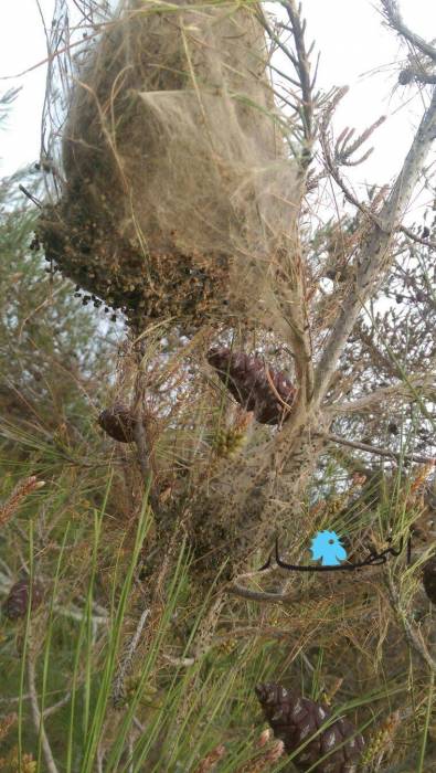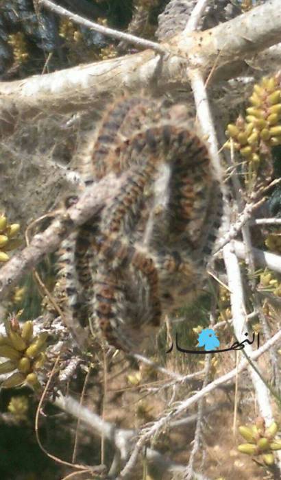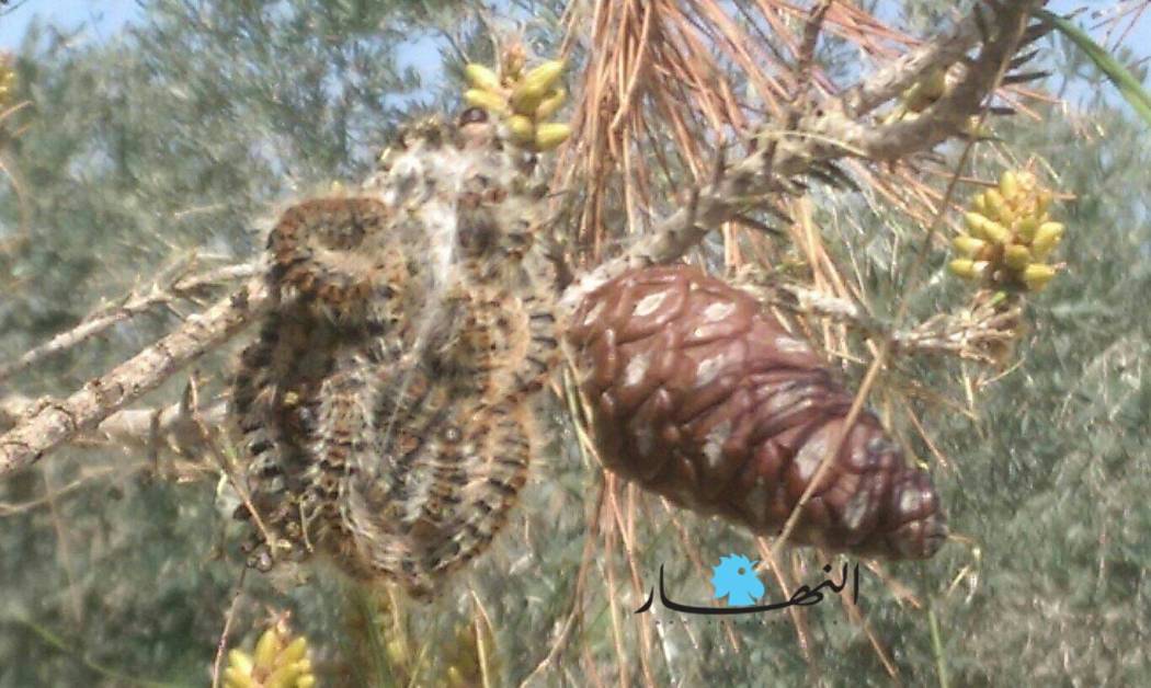 معظم اشجار الصنوبر تحوّل لونها من الأخضر الى البنّي وتحوّلت ثمارها بيوتا من خيطان نسجتها دودة الصندل التي تتغذّى من اغصانها الخضراء وتبني اعشاشا لها فيها للتناسل. وتنتقل هذه الدودة من شجرة الى اخرى وتتسبّب ايضا بحساسية للمواطنين الذين يقتربون من الاشجار. و يذكر بعض المعنيين ان الصيد هو سبب اساسي في تزايد هذه الدودة التي تقضي عليها بعض انواع الطيور، وان نفقات القضاء عليها باهظة بالنسبة للمواطنين الذين يلجأون الى قطع الاشجار اليابسة تحسبا من انتقال العدوى الى باقي الاشجار، الا ان هذا الحلّ لا يُعتبر جذريا فالحاجة الى رشّ الاحراج بالمبيدات أمر ضروري ومستعجل قبل ان يفتك المرض بكل الاشجار.
