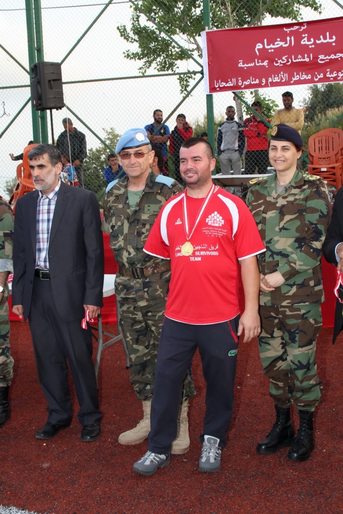 بمناسبة اليوم العالمي للتوعية من الألغام، نظّمت قوات اليونيفيل في القطاع الشرقي بالتعاون مع مركز مكافحة الألغام (LMAC) التابع للجيش اللبناني ومنظمات المجتمع المدني المحلّية وأعضاء اللجنة الوطنية للتوعية من مخاطر الألغام (MRE) والجمعية اللبنانية للعناية بالمعاقين (LWAH) حدثاً في الملعب البلدي لكرة القدم في بلدة الخيام في 15 نيسان 2016.