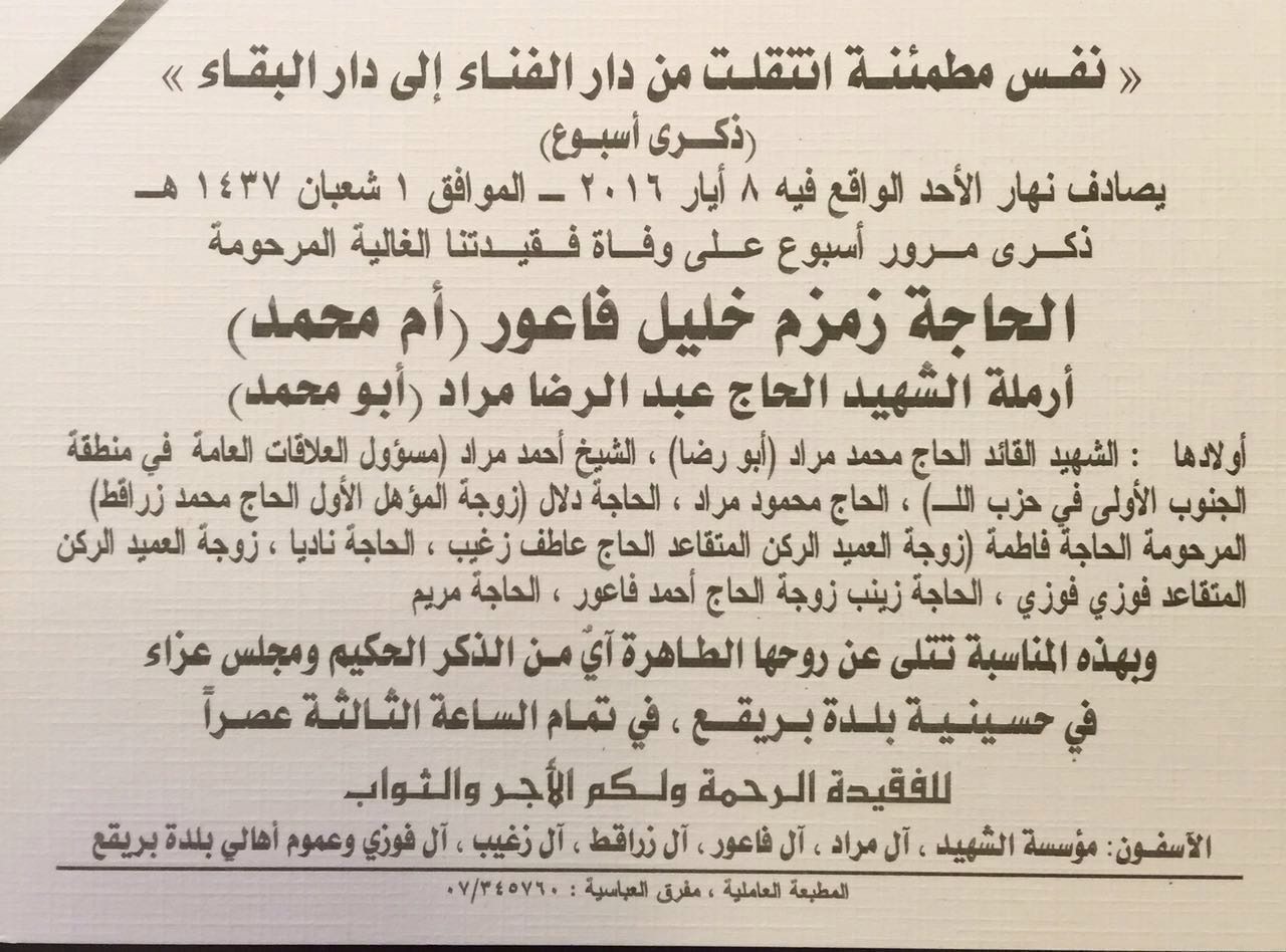 يصادف نهار الأحد 2016 5 8 ذكرى مرور أسبوع على وفاة المرحومة الحاجة زمزم خليل فاعور(أم محمد مراد ) والدة الشهيد محمد مراد والشيخ احمد مراد ( مسؤول العلاقات العامة في حزب الله المنطقة الأولى ) والحاج محمود مراد
