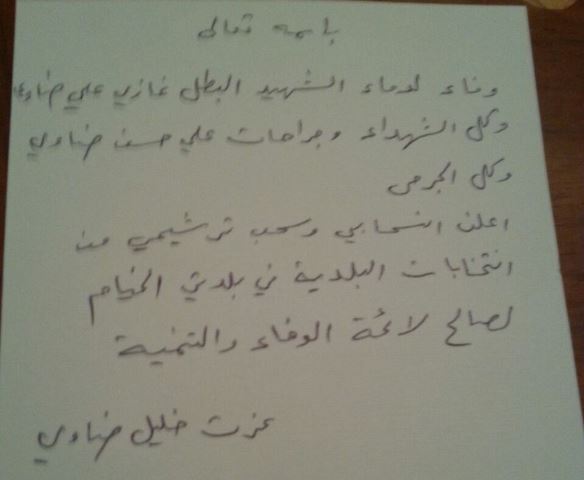 كنا وما زلنا نقول بأن جميع المرشحين هم اخوة لنا وأولادنا وجميعهم يتسابقون ويتنافسون للخدمة العامة ، ولندع المفاهيم السابقة بأن هذه اللأئحة ضد تلك ولنضع يدنا بأيدي بعض لخدمة البلد ، ولا نتخذ من شعار جورج بوش الإبن : من ليس معنا فهو ضدنا .. الجميع يقدسون المقاومة ، وفي اللائحة المنافسة اعضاء في المجلس البلدي الذي ستنتهي مدته ، وهذا يؤكد بأنهم اخوة وليس ضد كما يحلو للبعض .