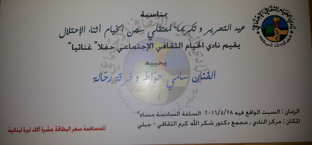 بمناسبة عيد التحرير وتكريماً لمعتقلي سجن الخيام اثناء الإحتلال، يقيم نادي الخيام الثقافي الإجتماعي حفلاً غنائياً