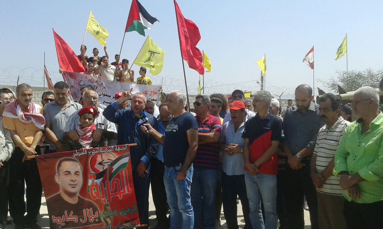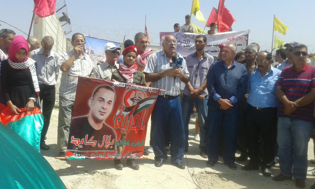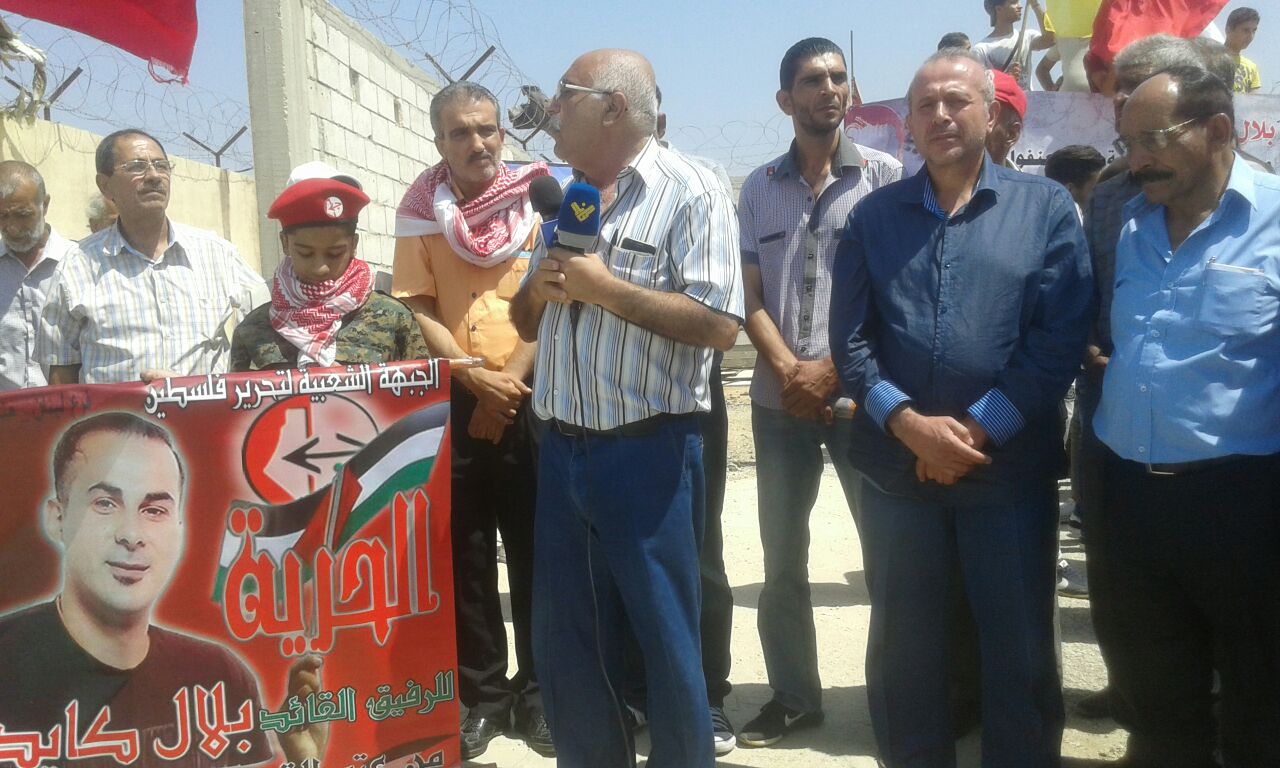 كلمة الجبهة الشعبية لتحرير فلسطين ألقاها أبو جابر، مسؤول العلاقات السياسية للجبهة الشعبية لتحرير فلسطين في لبنان، الذي بدأها بتوجيه التحية والفخر للمقاومة في انتصارها على المحتل الصهيوني وطرده مرغماً من لبنان جنوبه الصامد وكما وجه أبو جابر في كلمته التحية والتقدير والاعتزار للقائد بلال كايد على صموده وإصراره على مقاومة سجانيه، وإدارة وسلطة السجون الصهيونية، لنيله الحرية وكان ما أراد لبلال أنه نال حريته على أمل أن يفرج عنه قريباً، ليكون بين رفاقه وأهله ومحبيه وشعبه، ليمارس عمله الجهادي والمقاوم من جديد حتى تحقيق أهدافه وأهداف الشعب الفلسطيني بتحرير فلسطين وتحرير المعتقلين والأسرى من سجون ومعتقلات الكيان الصهيوني الغاصب. وأضاف أبو جابر نحن هنا لنحيي ذكرى استشهاد أبو علي مصطفى الذي عاد إلى أرض فلسطين ليناضل جنباً إلى جنب مع رفاقه مرددا مقوله أبو علي مصطفى عدنا إلى أرض الوطن لنقاوم ولن نساوم، واستشهد أبو علي على أرض فلسطين ليفتح الطريق أمام انتفاضة جديدة للشعب الفلسطيني امتدت على كل أرض فلسطين، مؤكداً من خلال استشهاده أننا جبهة عصية على الكسر والخنوع، وجاء انتخاب سعدات أميناً عاماً للجبهة، وتمت عملية اغتيال رحبعام زئيفي، ليؤكد للعالم أجمع بأننا جبهة الحكيم، وأبو علي مصطفى، وأحمد سعدات، وغسان كنفاني، وأبو ماهر اليماني، جبهة الشهداء، والجرحى، والمعتقلين، والأسرى، جبهة قدمت قافلة طويلة وكبيرة من الشهداء وخيرة قادتها بأنها جبهة لن تركع ولن تستكين ولن تساوم عن ذرة تراب من أرض فلسطين جبهة ستبقى متمسكة بالمقاومة والنضال حتى تحقيق أهداف شعبنا الفلسطيني في الحرية والاستقلال والعودة وتحرير كل الأسرى من معتقلات وسجون الاحتلال الصهيوني. وفي ختام كلمته وجه أبو جابر التحية للشهداء، والمعتقلين، والأسرى، وللمقاومين على أرض لبنان وفلسطين، كما أشار في كلمته كلمته إلى التمسك بأمن واستقرار لبنان، ولن نكون مع طرف ضد طرف آخر، كما طالب أبو جابر الدولة اللبنانية بالنظر إلى وضع الفلسطينين في لبنان ومعاملتهم معاملة تليق بهم، وإعطائهم حقوقهم المدنية والاجتماعية إلى حين عودتهم إلى فلسطين، وأكد رفض الشعب الفلسطيني بكل فئاته التوطين والتهجير.وفي ختام الوقفة التضامنية وجه فتحي أبو علي للحضور، والمشاركين، ووسائل الإعلام، والفضائيات، ولجنة الأسرى، والمعتقلين في سجون الاحتلال الصهيوني، وللقيمين على معتقل الخيام لإتاحتهم الفرصة للقاء والتضامن هنا مع بلال كايد، وإحياء لذكرى استشهاد أبي علي مصطفى، معاهدهم على الاستمرار في نهج المقاومة والمقاومين.