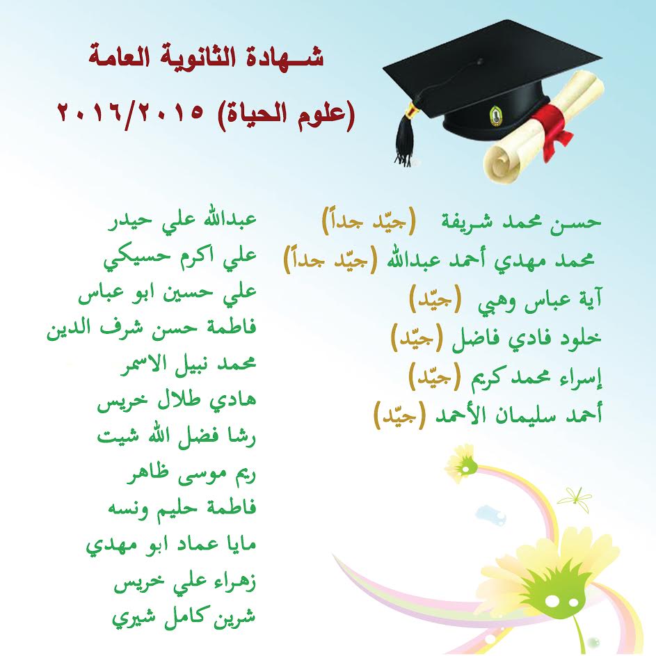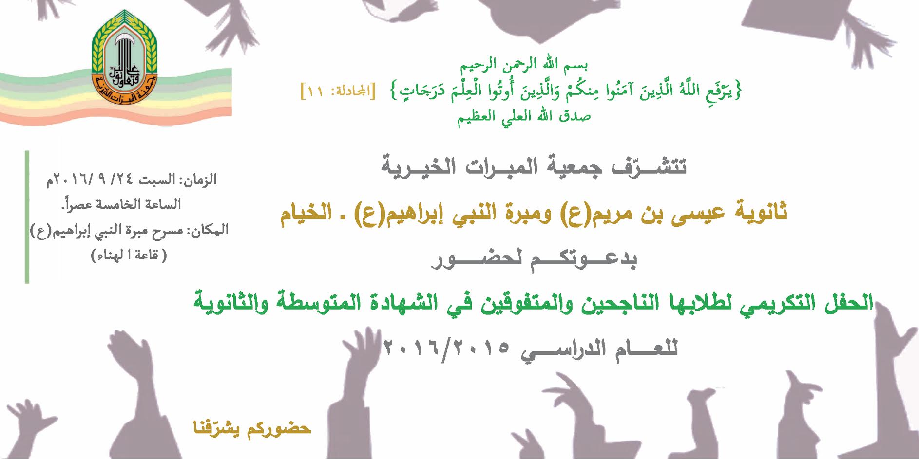 تستعد ثانوية عيسى بن مريم (ع) ومبرة النبي إبراهيم (ع) - الخيام لإقامة حفل تكريمي لطلابها الناجحين والمتفوقين في الشهادة المتوسطة والثانوية للعام الدراسي 2016/2015
