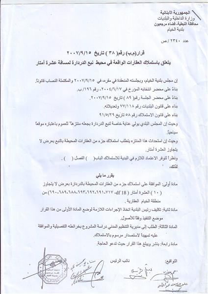 وكان المجلس البلدي الأسبق (2004 ـ 2010) برئاسة علي زريق قد قرّر في جلسته المنعقدة بتاريخ 15 أيلول 2007 «الموافقة على استملاك جزء من العقارات المحيطة بالدردارة بعرض لا يتجاوز 10 أمتار وهي (DF 18 ـ 717 ـ 691 ـ 692 ـ 693 ـ 688 ـ 689 ـ 690) من منطقة الخيام العقارية».