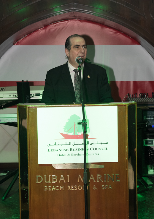 "يشكّل حفل العشاء السنوي بمناسبة عيد الاستقلال اللبناني منصةً لترسيخ جسور التواصل المباشر وبناء العلاقات المتينة بين أفراد الجالية اللبنانية المقيمة على أرض دولة الإمارات، وفي الوقت نفسه للاحتفاء معاً بقيم الاستقلال والانتماء والتضحية التي تتوارثها الأجيال باعتبارها ركيزة أساسية في ثقافة السلام والازدهار وحب الوطن. ونحن إذ نحتفي بعيد الاستقلال اللبناني الثالث والسبعين، لا يفوتنا أيضاً أن نشكر دولة الإمارات العربية المتّحدة، قيادةً وحكومةً وشعباً، على احتضان الجالية اللبنانية، والتي نرى فيها مصدر إلهام يحتذى به وبإصراره في ترسيخ روح الولاء والانتماء والوطنية في نفوس المجتمع من المواطنين والمقيمين على حد سواء".
