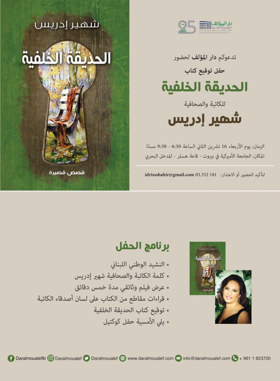 وقعت إبنة الخيام، الاعلامية في تلفزيون المستقبل والكاتبة شهير ادريس كتابها الاول بعنوان الحديقة الخلفية ضمن فعاليات معرض بيروت العربي والدولي للكتاب وذلك بحضور شخصيات سياسية واعلامية واجتماعية وذلك في جناح دار المؤلف ...وتزامن التوقيع مع احتفال الدار بيوبيله الفضي بمرور 25 عاما على تأسيسه .
