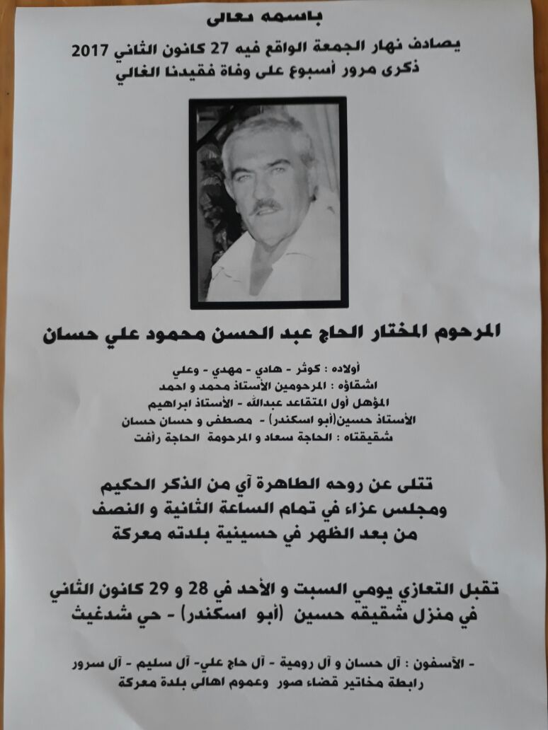 تصادف نهار الجمعة الواقع فيه 27 ك2 2017 ذكرى مرور أسبوع على وفاة المرحوم