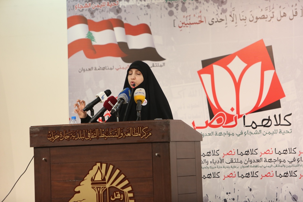 كلمة الملتقى اللبناني القاها رئيس جمعية ابداع الشاعر علي عباس الذي أكد على المبادىء الانسانية للشعب اللبناني المقاوم التي انطلق باكراً لمواجهة العدوان في لبنان وأدان العدوان الغاشم على اليمن . وقال: ان وقوفنا مع اليمن الشقيق نابع من الشعور بالمسؤولية الوطنية والقومية وختم بقصيدة جاء فيها : هنا مستودع الأسرار .. وصفوة الأنصار ..ولا عجب .. من دونها .. لا رجال .. ولا نزال .. ولا قتال ولا عرب! هنا مقبرة الغزاة .. هنا كعبة الأباة . .هنا الضاحية .. هنا اليمن .