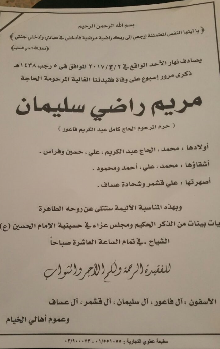 يصادف نهار الاحد الواقع في 2 نيسان 2017 ذكرى مرور أربعين يوماً على وفاة المرحومة