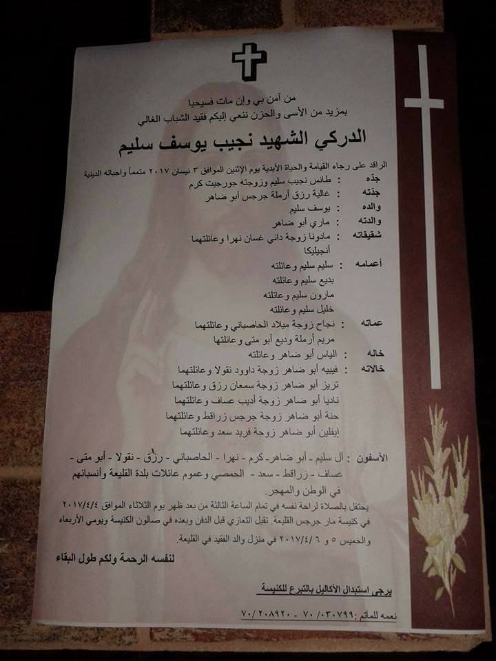 تستقبل بلدة القليعة الجنوبية بحزن واسى جثمان فقيد الشباب الغالي الدركي نجيب يوسف سليم ( 25 عاماً) عند الساعة 12 ظهراً قرب تمثال السيدة العذراء في البلدة.